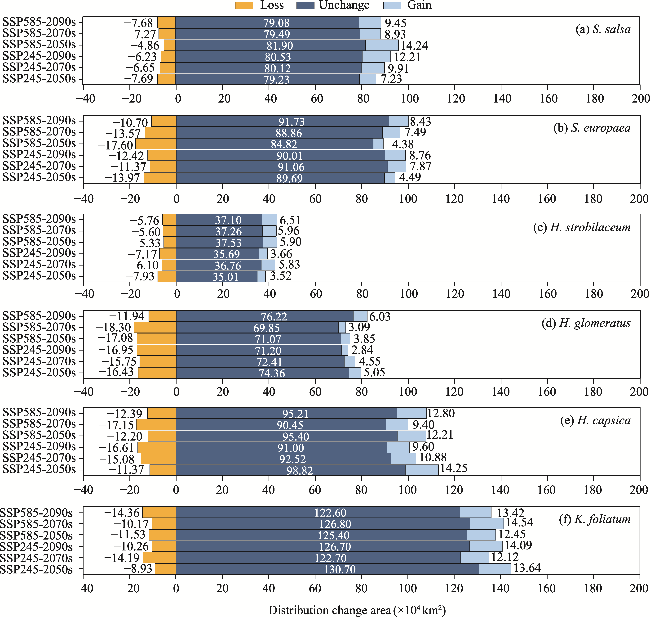 Fig. 5 Distribution change areas of the suitable habitats for the six halophytic plant species in the future (2050s, 2070s, and 2090s) under two climate scenarios (SSP245 and SSP585) compared to the current conditions. (a), S. salsa; (b), S. europaea; (c), H. strobilaceum; (d), H. glomeratus; (e), H. capsica; (f), K. foliatum. |