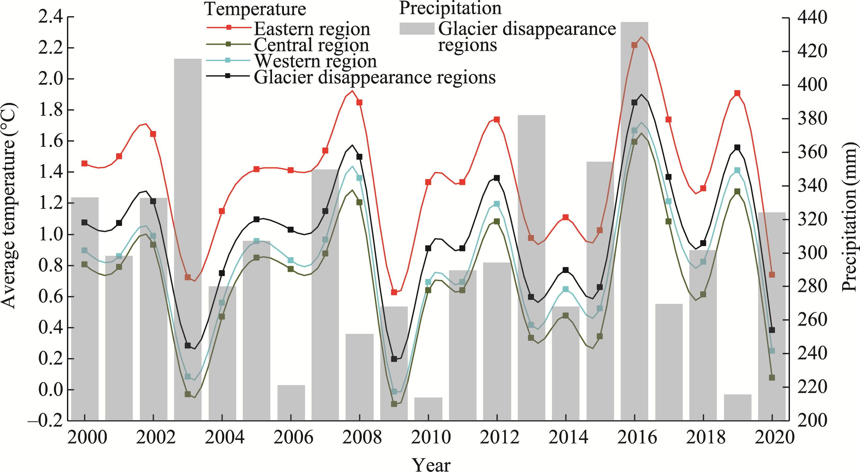 Fig. 10 Temporal variations of summer average temperature and summer precipitation in the glacier disappearance regions of the Manas River Basin from 2000 to 2020. Eastern region, central region, and western region were three subdivisions of glacier disappearance regions. |