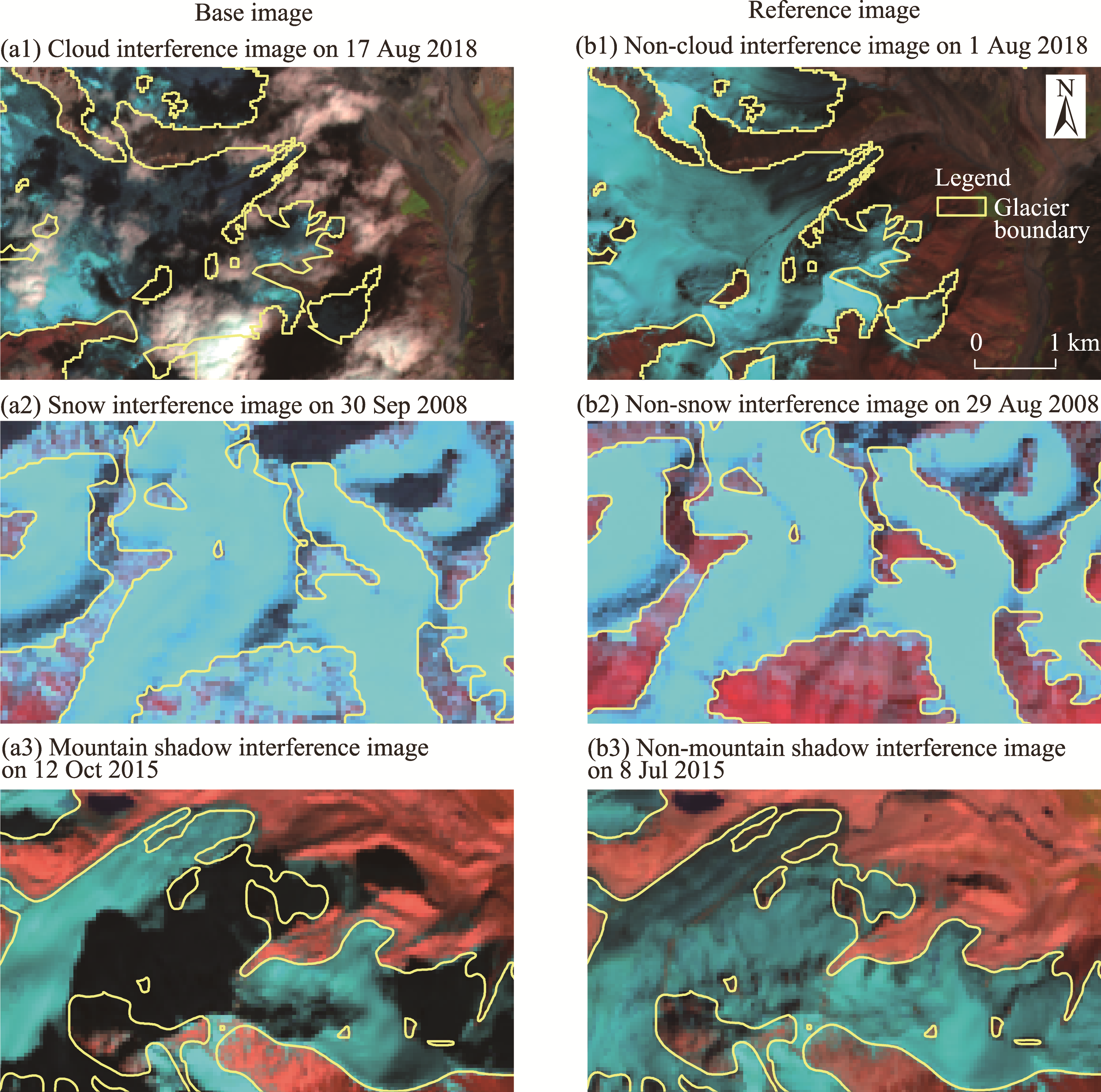 Fig. 2 Extraction of glacier boundaries based on base images with the least cloud cover, temporary snowfall, and mountain shadow interference (a1-a3) and reference images from adjacent years that can compensate for interference from clouds, temporary snowfall, and mountain shadows in the base images (b1-b3) |
