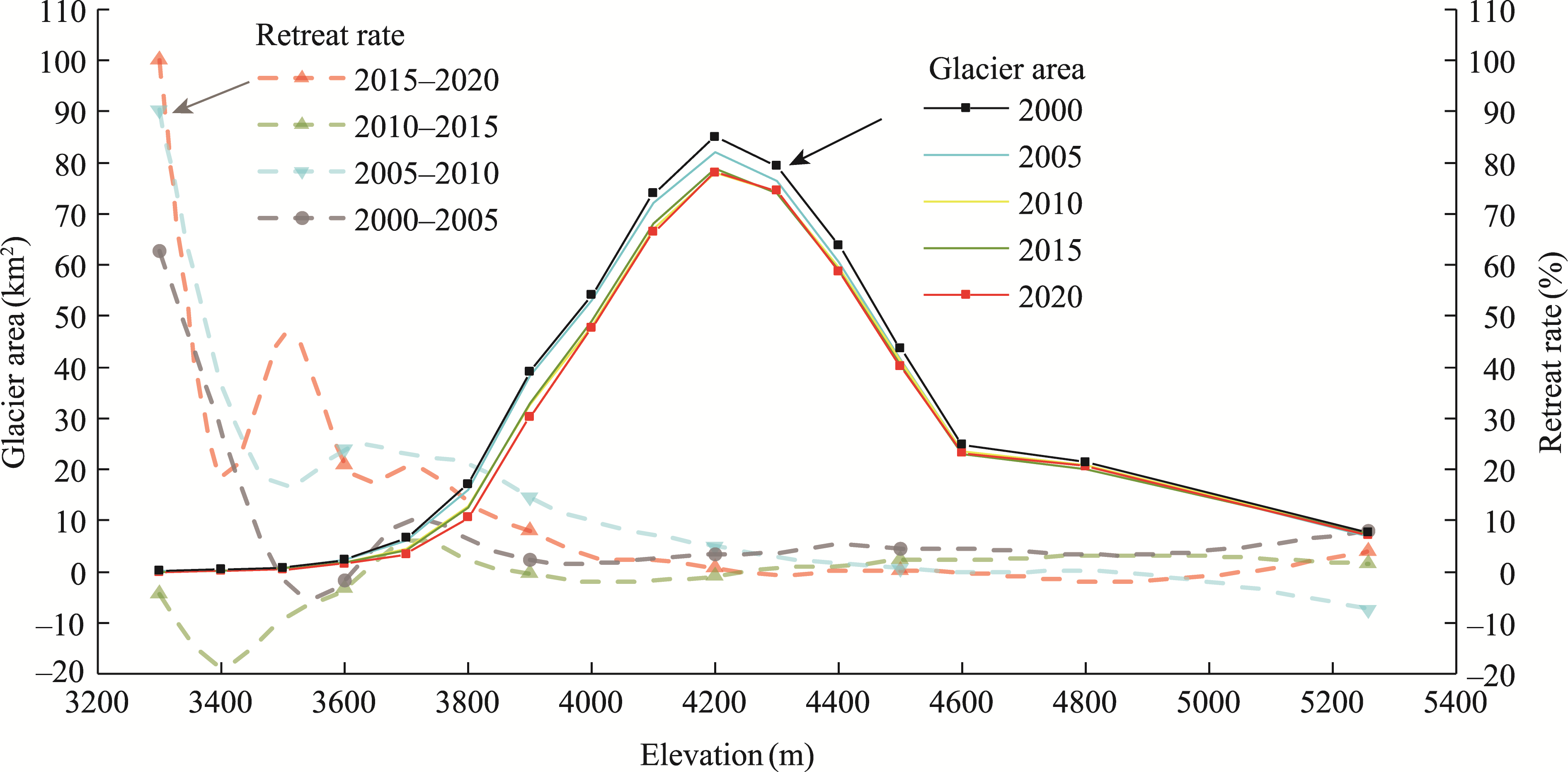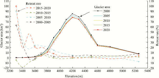 Fig. 6 Variation characteristics of glacier area with elevation in the Manas River Basin from 2000 to 2020 |