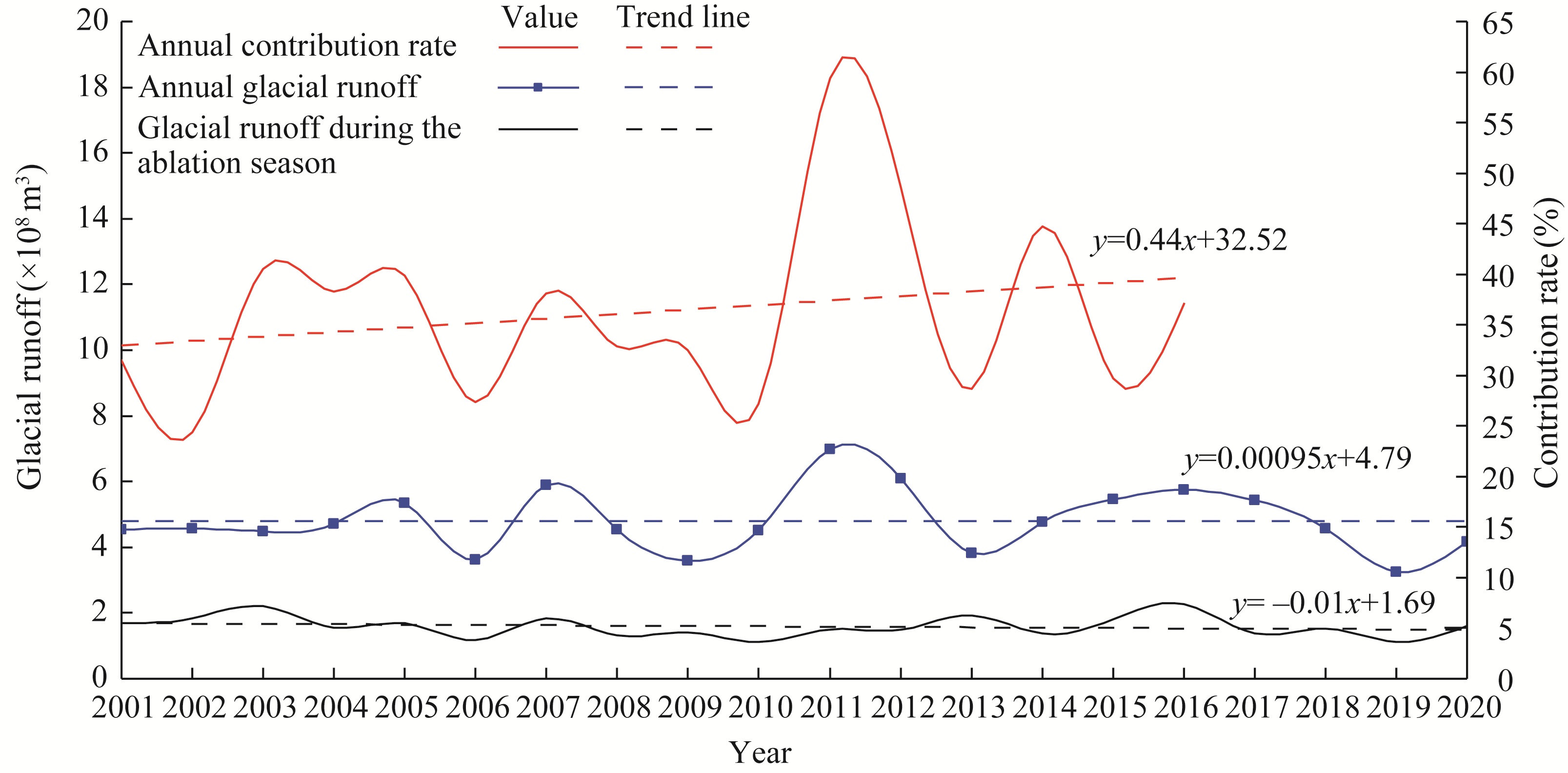 Fig. 8 Temporal variations of glacial runoff and its contribution rates to river runoff in the Manas River Basin from 2000 to 2020. Due to limitations in the observed river runoff data, annual contribution rate data were only available up to 2016. |