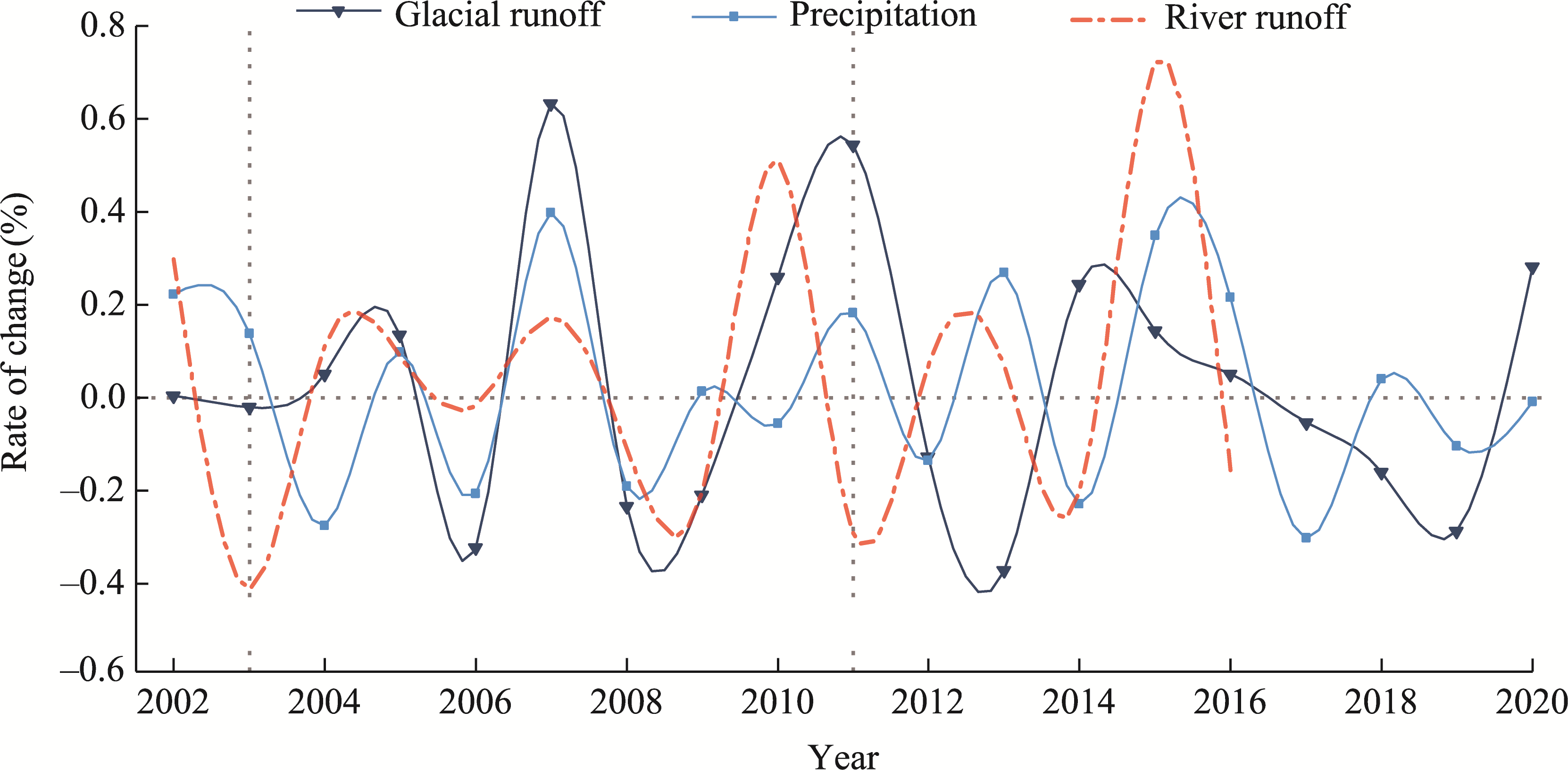 Fig. 9 Relationship between rates of change in glacial runoff, precipitation, and observed river runoff in the Manas River Basin from 2000 to 2020 |