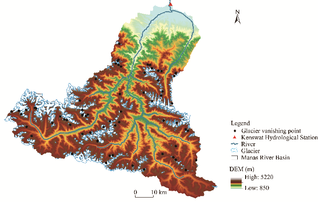 Fig. 1 Overview of the Manas River Basin based on the digital elevation model (DEM) and spatial distribution of glaciers based on the Second Chinese Glacier Inventory and glacier vanishing points determined in this study. The Second Chinese Glacier Inventory data were from the National Cryosphere Desert Data Center (http://www.ncdc.ac.cn/). |