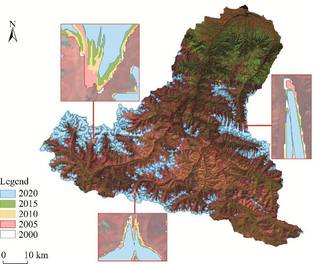Fig. 3 Spatial distribution of the extracted glaciers in the Manas River Basin and localized comparison of glacier boundaries during 2000-2020 |