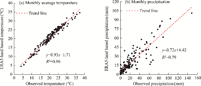 Fig. 4 Accuracy assessment of monthly average temperature (a) and monthly precipitation (b) data from EAR5-land during June-September compared with the station observations |