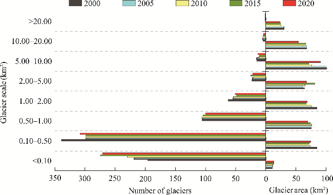 Fig. 5 Distribution and variation characteristics of glaciers at different scales in the Manas River Basin from 2000 to 2020 |