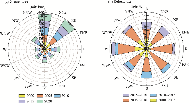 Fig. 7 Variation characteristics of glacier area (a) and retreat rate (b) according to slope directions in the Manas River Basin from 2000 to 2020. N, north; NNE, north-northeast; NE, northeast; ENE, east-northeast; E, east; ESE, east-southeast; SE, southeast; SSE, south-southeast; S, south; SSW, south-southwest; SW, southwest; WSW, west-southwest; W, west; WNW, west-northwest; NW, northwest; NNW, north-northwest. |