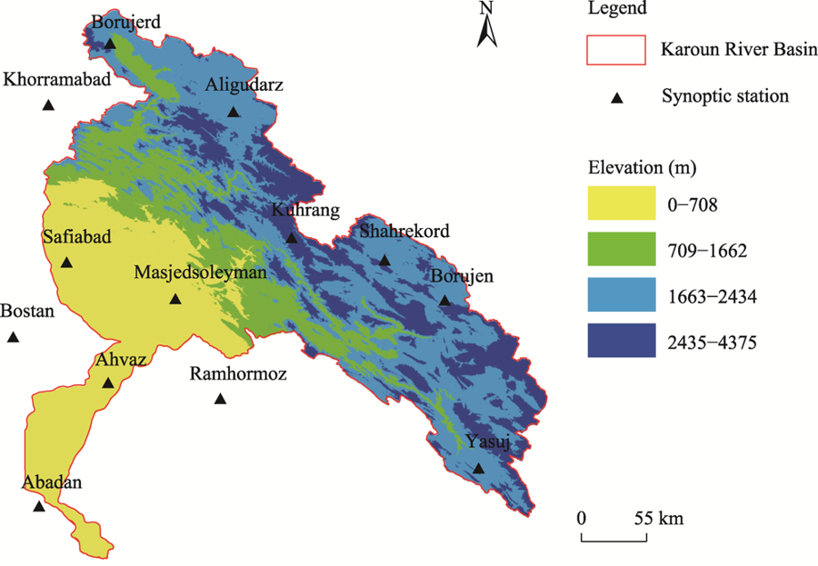 Fig. 1 Location and spatial distribution of synoptic stations in the Karoun River Basin (KRB) |