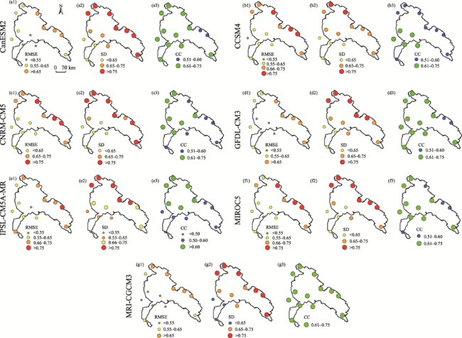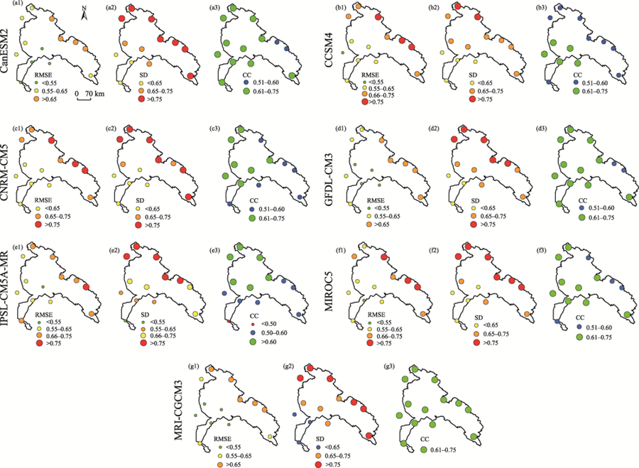 Fig. 2 Spatial distribution of root mean square error (RMSE) and correlation coefficient (CC) of SPI calculated based on Global Climate Models (GCMs) and synoptic stations as well as spatial distribution of standard deviation (SD) of SPI calculated from each Global Climate Model (GCM). (a1-a3), Canadian Earth System Model version 2 (CanESM2); (b1-b3), Community Climate System Model version 4 (CCSM4); (c1-c3), Center National for Research Meteorological Climate Model version 5 (CNRM-CM5); (d1-d3), Geophysical Fluid Dynamics Laboratory Coupled Model version 3 (GFDL-CM3); (e1-e3), Institute Pierre Simon Laplace Climate Model phase 5 Atmospheric Mid Resolution (IPSL-CM5A-MR); (f1-f3), Model for Interdisciplinary Research on Climate version 5 (MIROC5); (g1-g3), Meteorological Research Institute Coupled Global Climate Model version 3 (MRI-CGCM3). |