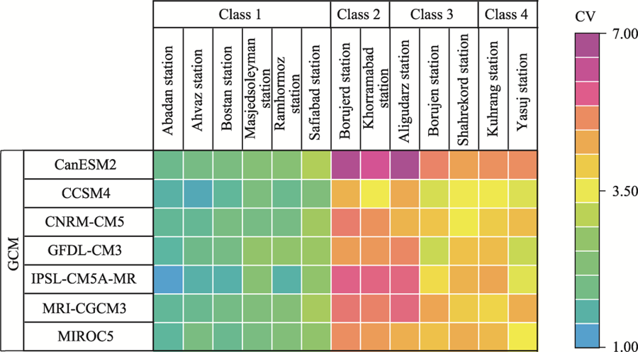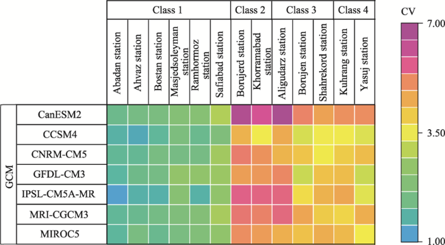 Fig. 4 Matrix plot of coefficient of variation (CV) between GCMs and synoptic stations. Class 1 (-4.0-700.0 m), Class 2 (700.0-1660.0 m), Class 3 (1660.0-2430.0 m), and Class 4 (2430.0-4375.0 m) are four distinct elevation classes that are divided based on the Shuttle Radar Topography Mission (SRTM) Digital Elevation Model (DEM). |