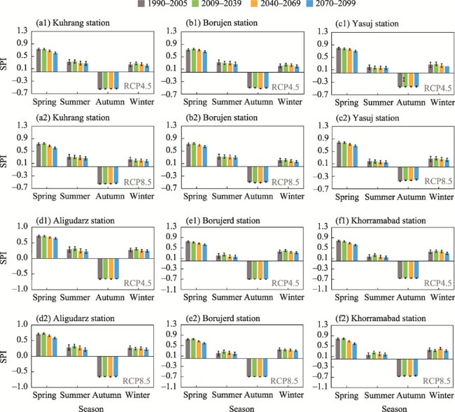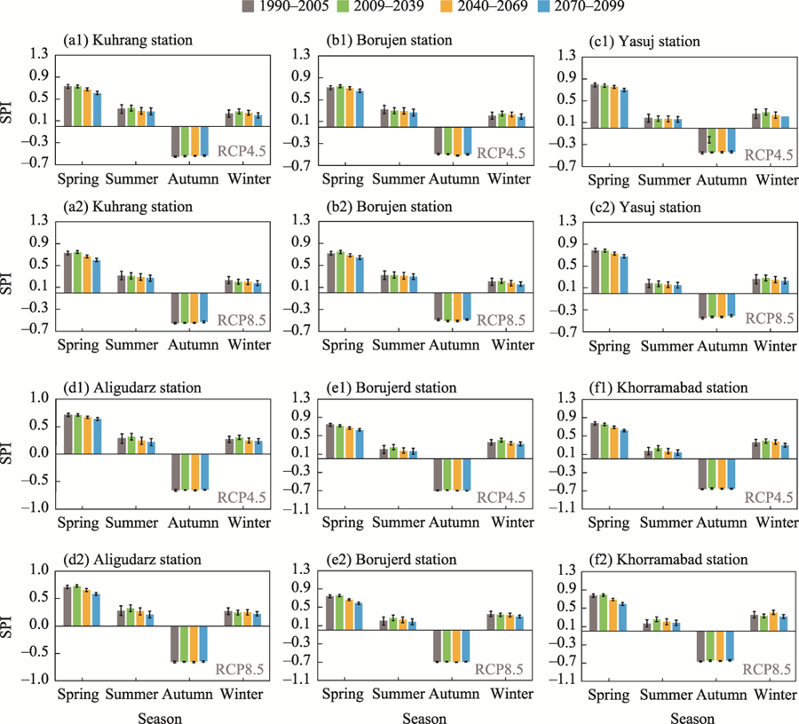 Fig. 8 Seasonal variations of SPI under RCP4.5 and RCP8.5 scenarios in Kuhrang (a1 and a2), Borujen (b1 and b2), Yasuj (c1 and c2), Aligudarz (d1 and d2), Borujerd (e1 and e2), and Khorramabad (f1 and f2) stations. Bars represent standard errors. |