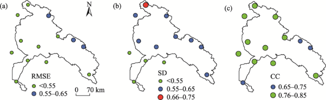 Fig. 3 Spatial distribution of RMSE (a), SD (b), and CC (c) of SPI calculated from the average of all GCMs and observations |