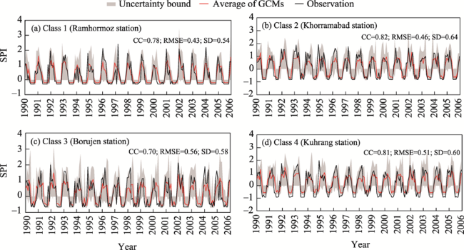 Fig. 5 Time series of SPI in each elevation class during 1990-2005. (a), Class 1 (Ramhormoz station); (b), Class 2 (Khorramabad station); (c), Class 3 (Borujen station); (d), Class 4 (Kuhrang station). |