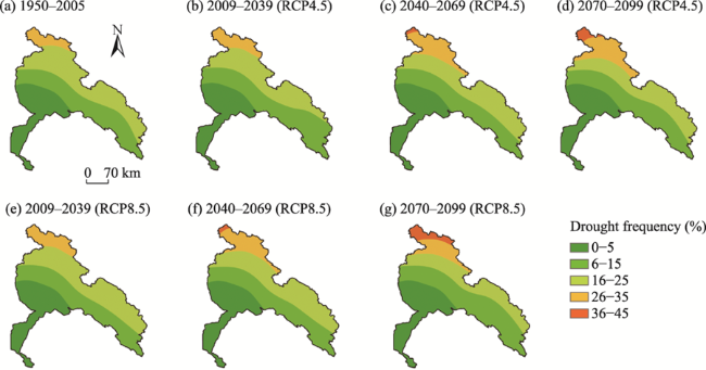 Fig. 6 Spatial distribution of drought frequency during 1990-2005 (a), 2009-2039 (b and e), 2040-2069 (c and f), and 2070-2099 (d and g) under RCP4.5 and RCP8.5 scenarios |