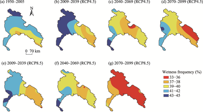 Fig. 7 Spatial distribution of wetness frequency during 1990-2005 (a), 2009-2039 (b and e), 2040-2069 (c and f), and 2070-2099 (d and g) under RCP4.5 and RCP8.5 scenarios |