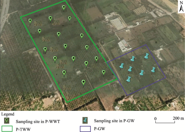 Fig. 1 Overview of the study area and soil sampling sites. P-TWW, plot irrigated with treated wastewater (TWW); P-GW, plot irrigated with groundwater (GW). |