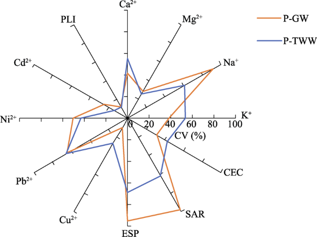 Fig. 2 Comparison of coefficient of variation (CV) of soil parameters between P-TWW and P-GW. CEC, cation exchange capacity; SAR, sodium adsorption ratio; ESP, exchangeable sodium percentage; PLI, pollution load index. |
