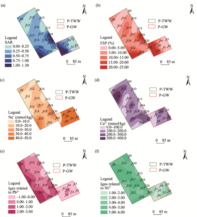 Fig. 3 Spatial distribution of SAR (a), ESP (b), Na+ (c), Ca2+ (d), geoaccumulation index (Igeo) related to Pb2+ (e), and Igeo related to Ni2+ (f) in P-TWW and P-GW |