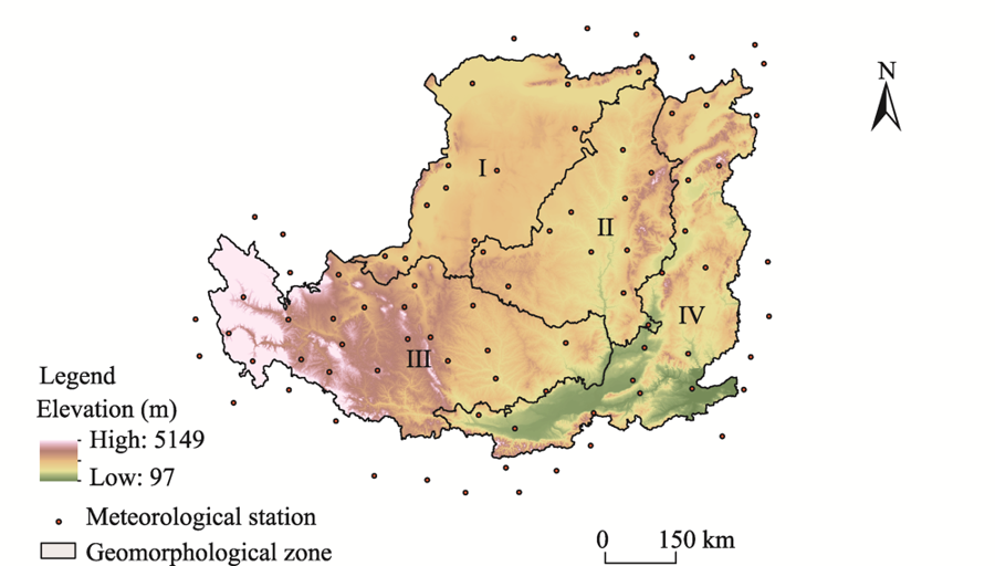 Fig. 1 Overview of the study area and spatial distribution of the four geomorphological zones. Zone I, northern aeolian sandy agricultural irrigation area; Zone II, hilly and gully area; Zone III, plateau and gully area; Zone IV, eastern river valley and rocky mountainous area. |