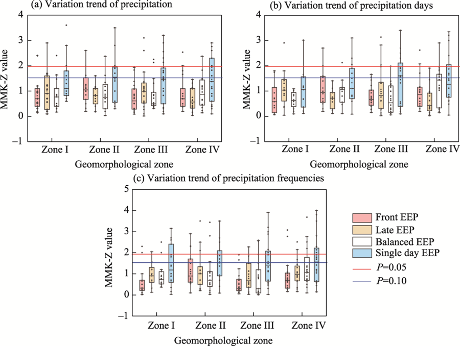Fig. 10 Variation trend of precipitation (a), precipitation days (b), and precipitation frequencies (c) of the four EEP types. MMK-Z value is the standard normalization statistic in the modified Mann-Kendall (MMK) test. The box represents the significant characteristics of precipitation trends for the four EEP types at stations in different zones. The short border of the boxes represents the range from the lower quantile (Q25) to the upper quantile (Q75). The dots and horizontal lines inside the boxes represent the means and medians, respectively. The dots outside the boxes represent outliers. The upper and lower whiskers indicate the maximum and minimum values, respectively. |