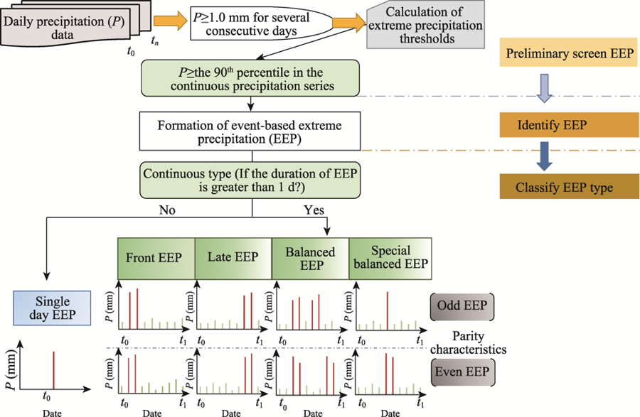 Fig. 2 Identification and classification of EEP types. t0, t1, and tn represent the start date, end date, and any day of EEP, respectively. The red bars denote extreme precipitation (EP; P≥the 90th percentile in the continuous precipitation series) and the green bars represent non EP (P<the 90th percentile in the continuous precipitation series). |