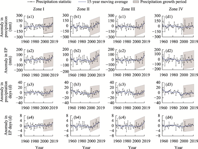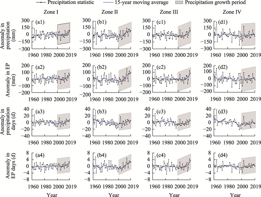Fig. 4 Variations in precipitation and extreme precipitation (EP) in Zone I (a1-a4), Zone II (b1-b4), Zone III (c1-c4), and Zone IV (d1-d4) from 1960 to 2019 |