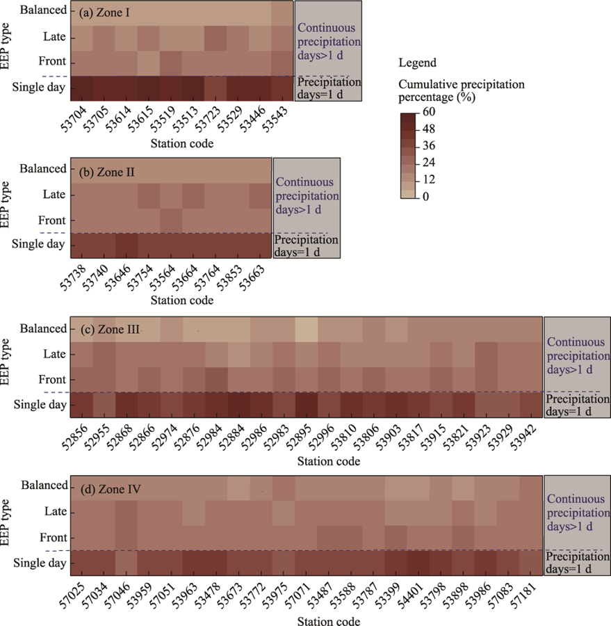 Fig. 7 Cumulative precipitation percentage of the four EEP types in Zone I (a), Zone II (b), Zone III (c), and Zone IV (d) |