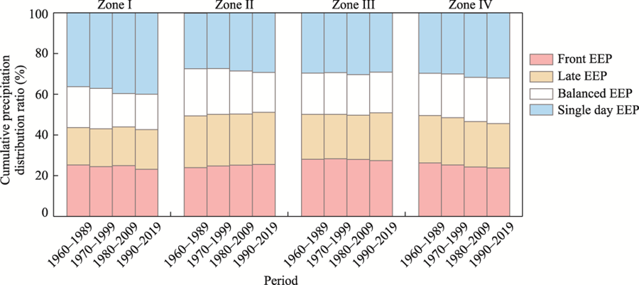 Fig. 9 Cumulative precipitation distribution ratio of the four EEP types during different periods |