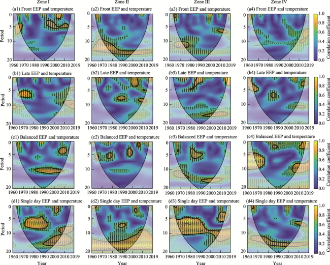 Fig. 12 Wavelet coherence analysis of the four EEP types and temperature in Zone I (a1-a4), Zone II (b1-b4), Zone III (c1-c4), and Zone IV (d1-d4). The thick black contour designates the correlations beyond the 95% significance level against the red noise. The cone of influence where edge effects might distort the picture is shown as a lighter shade. The relative phase relationship is indicated by the arrow direction, with in-phase pointing right and anti-phase pointing left. The color bar on the right denotes correlation coefficient, with 0.0 representing no correlation and 1.0 indicating strong relationship. |