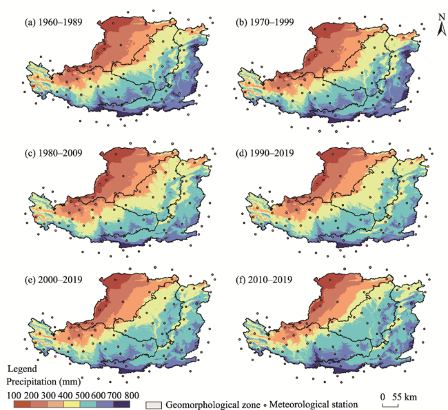 Fig. 3 Changes of the spatial patterns of precipitation during 1960-1989 (a), 1970-1999 (b), 1980-2009 (c), 1990-2019 (d), 2000-2019 (e), and 2010-2019 (f) |