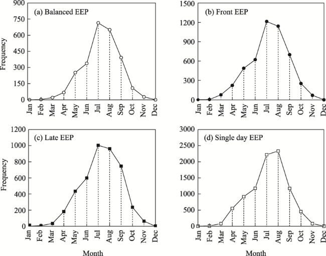Fig. 5 Characteristics of the intra-annual change of balanced EEP (a), front EEP (b), late EEP (c), and single day EEP (d) from 1960 to 2019 |