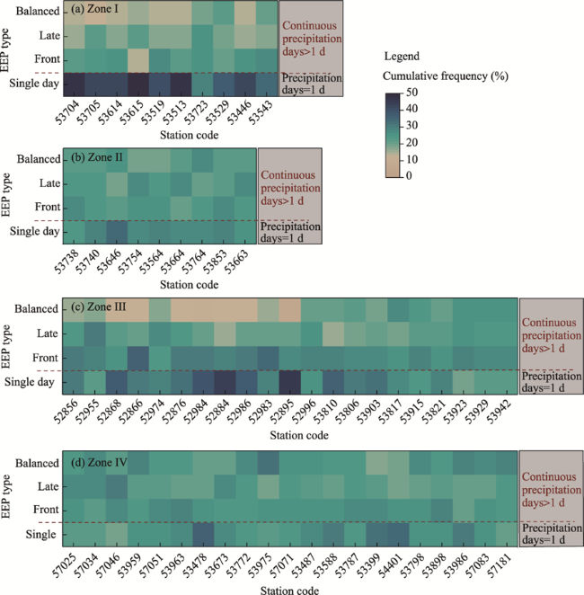 Fig. 6 Cumulative frequency of the four EEP types in Zone I (a), Zone II (b), Zone III (c), and Zone IV (d) |