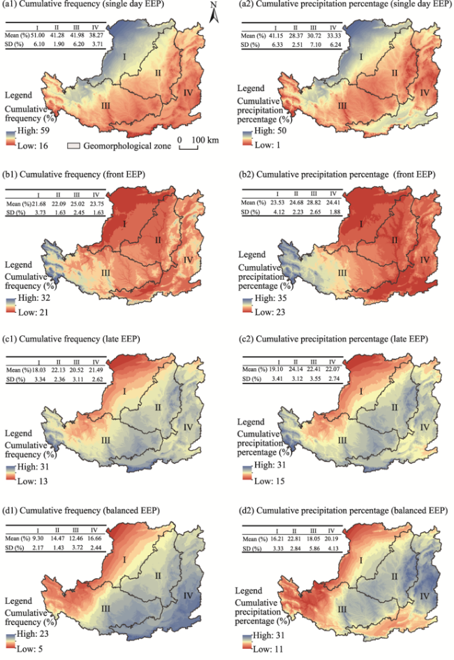 Fig. 8 Spatial distribution of cumulative frequency and cumulative precipitation percentage of single day EEP (a1 and a2, respectively), front EEP (b1 and b2, respectively), late EEP (c1 and c2, respectively), and balanced EEP (d1 and d2, respectively) |