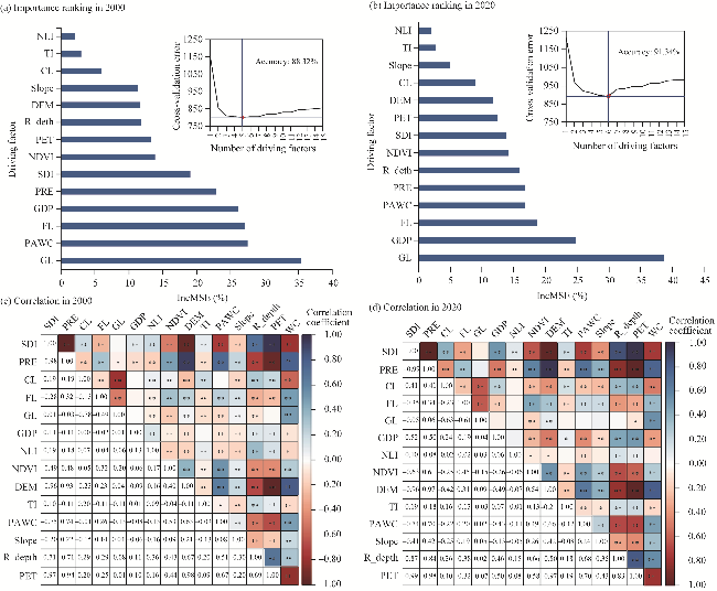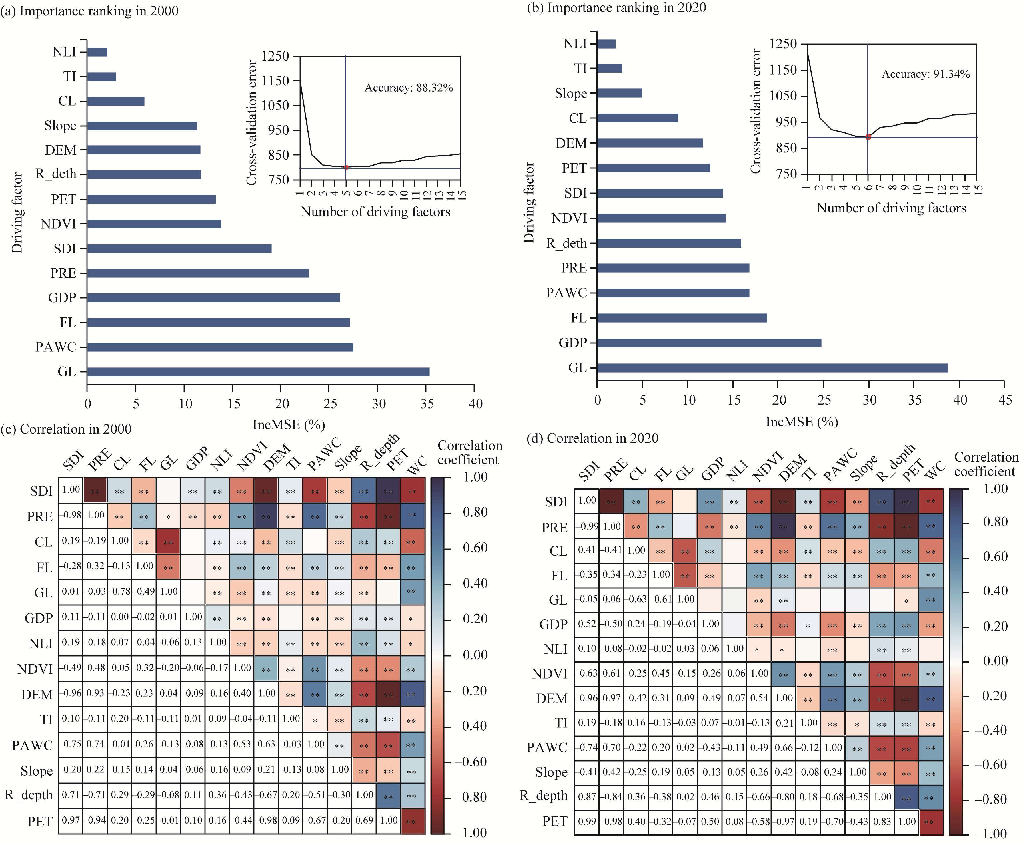 Fig. 9 Importance ranking of driving factors and corresponding cross-validation curve (a and b) and results of Pearson correlation analysis (c and d) in 2000 and 2020. NLI, nighttime light index; TI, topographic index; R_depth, plant root depth; NDVI, normalized difference vegetation index; SDI, spatial drought index; PRE, precipitation; GDP, gross domestic product; WC, water conservation depth; IncMSE, percentage of increase of mean square error. *, P<0.05 level; **, P<0.01 level. |