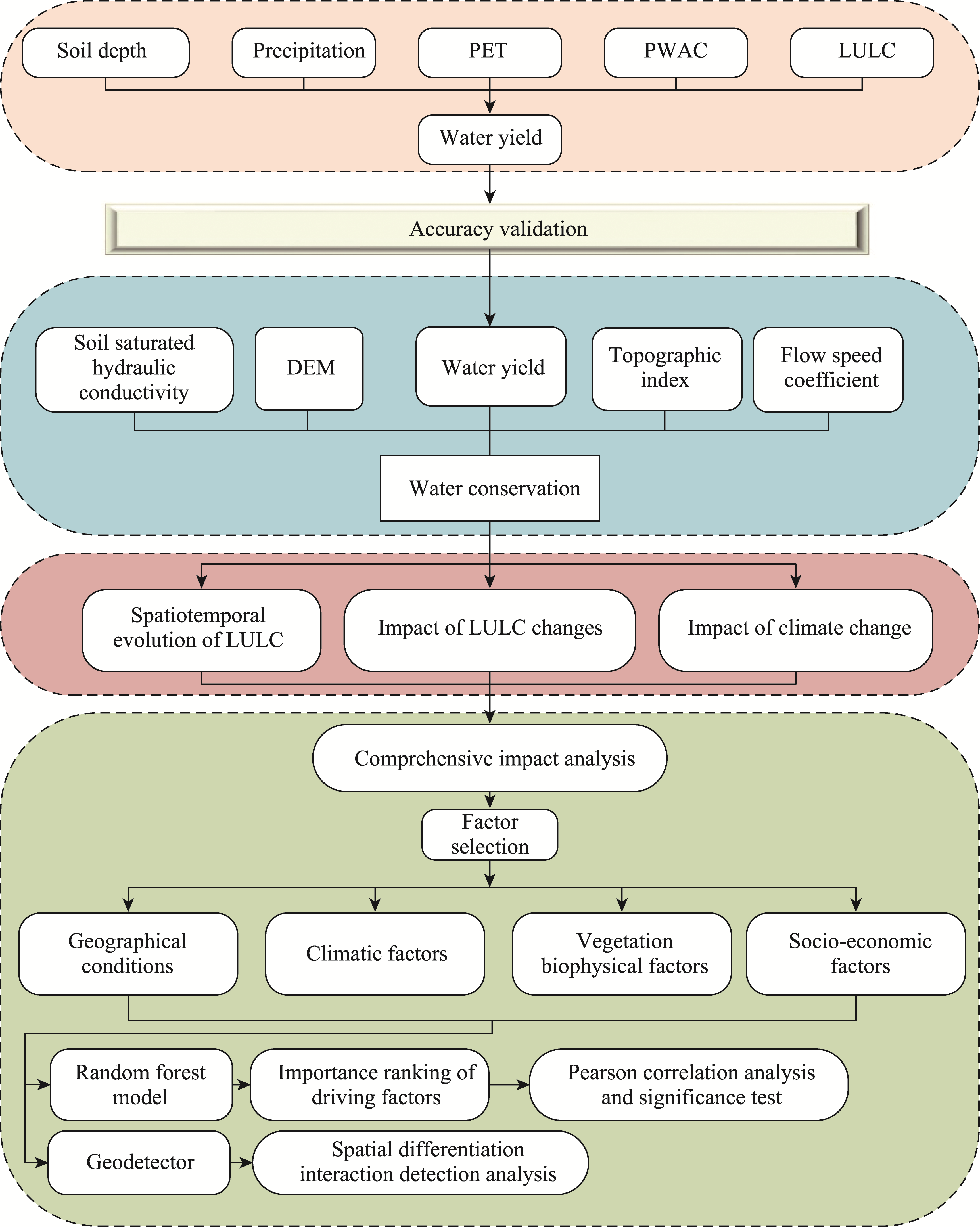 Fig. 2 Research framework of this study. PET, potential evapotranspiration; PAWC, plant available water content; LULC, land use/land cover. |