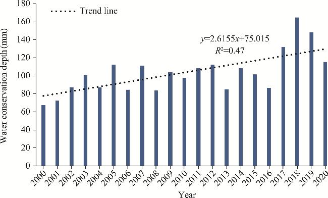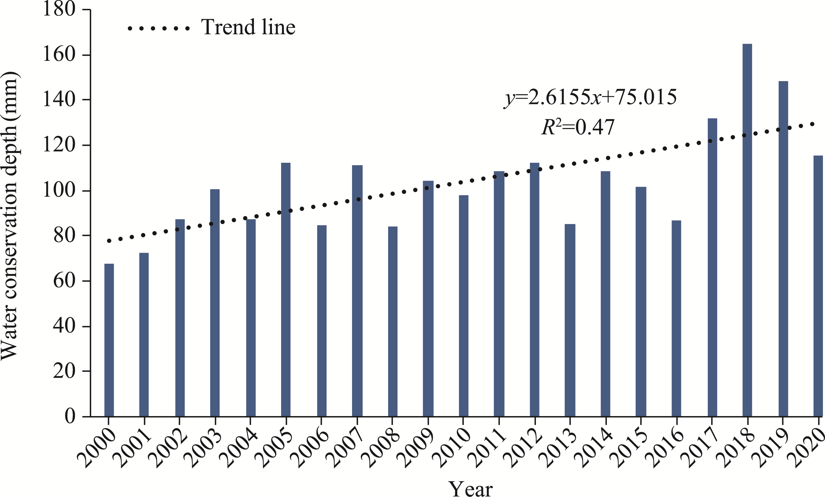 Fig. 4 Temporal variation in water conservation depth of the Huangshui River Basin from 2000 to 2020 |
