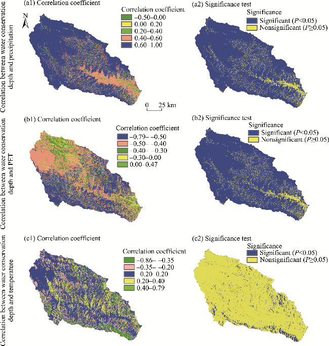 Fig. 8 Correlation of water conservation depth with precipitation (a1 and a2), PET (b1 and b2), and temperature (c1 and c2) in the Huangshui River Basin during 2000-2020 |