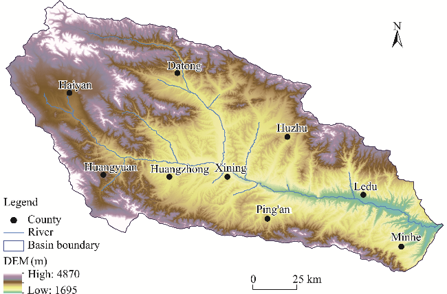 Fig. 1 Overview of the Huangshui River Basin based on digital elevation model (DEM) |