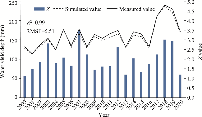 Fig. 3 Calibration of the parameter Z and validation of the simulated water yield depth in the Huangshui River Basin from 2000 to 2020. Z, seasonal constant; RMSE; root mean square error. |