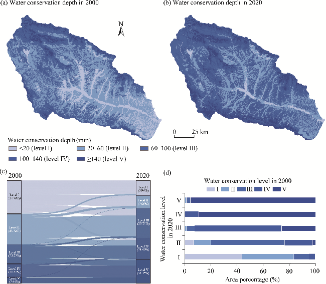 Fig. 5 Spatial variation in water conservation depth (a and b) and area transfer among different water conservation levels (c and d) in the Huangshui River Basin from 2000 to 2020 |