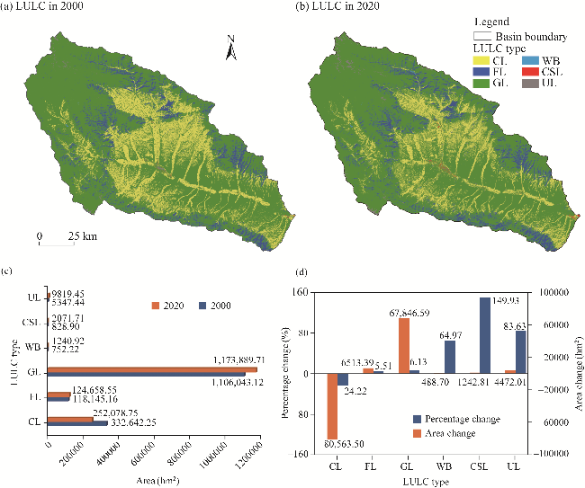 Fig. 6 Spatial variation in LULC (a and b) and changes in area of each LULC type (c and d) in the Huangshui River Basin from 2000 to 2020. CL, cropland; FL, forest land; GL, grassland; WB, water body; CSL, construction land; UL, unused land. |