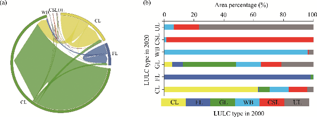 Fig. 7 Structure chart (a) and area percentage (b) showing the transfers among different LULC types in the Huangshui River Basin from 2000 to 2020 |