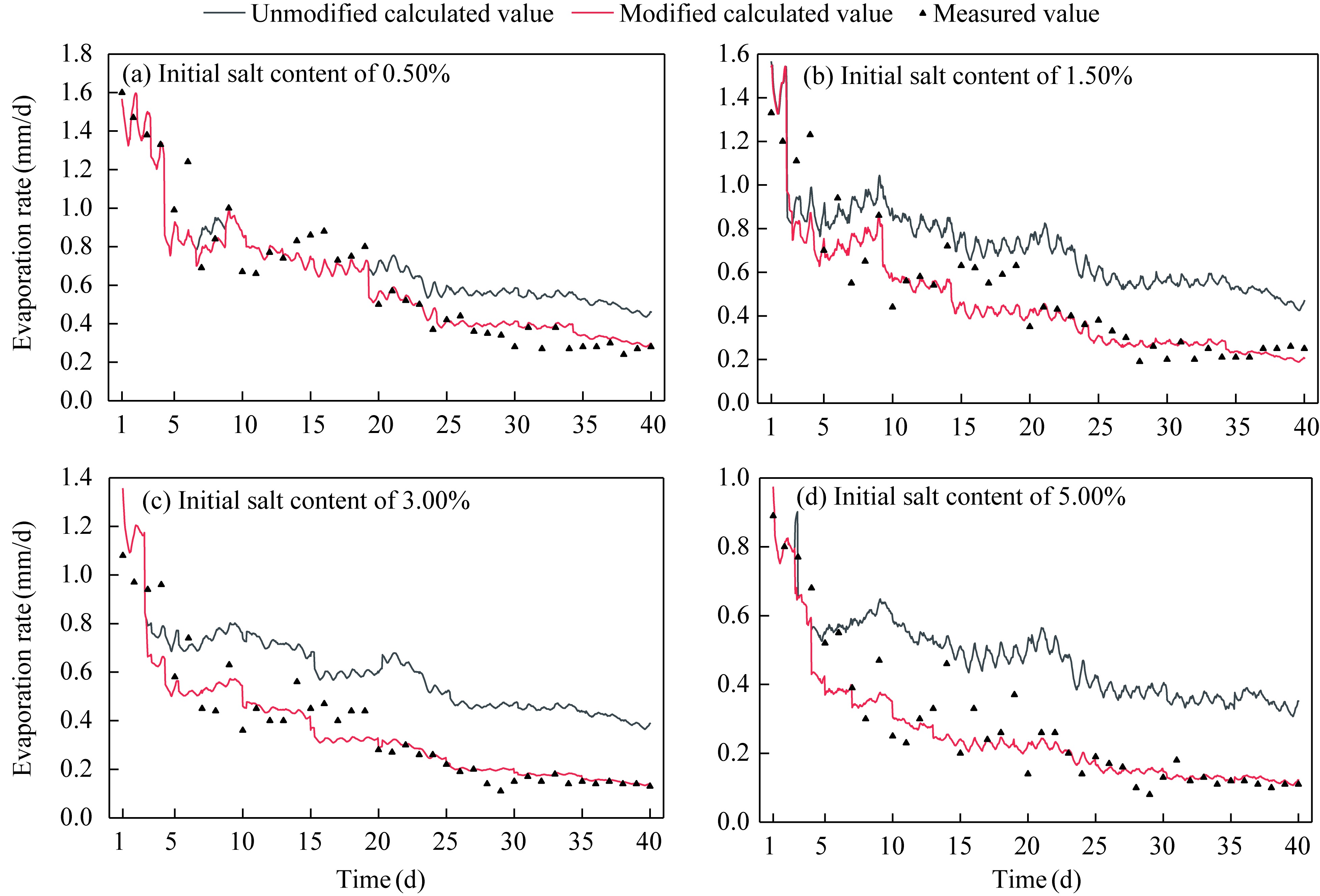 Fig. 11 Comparison of the calculated and measured evaporation rates with different initial salt contents. (a), initial salt content of 0.50%; (b), initial salt content of 1.50%; (c), initial salt content of 3.00%; (d), initial salt content of 5.00%. |