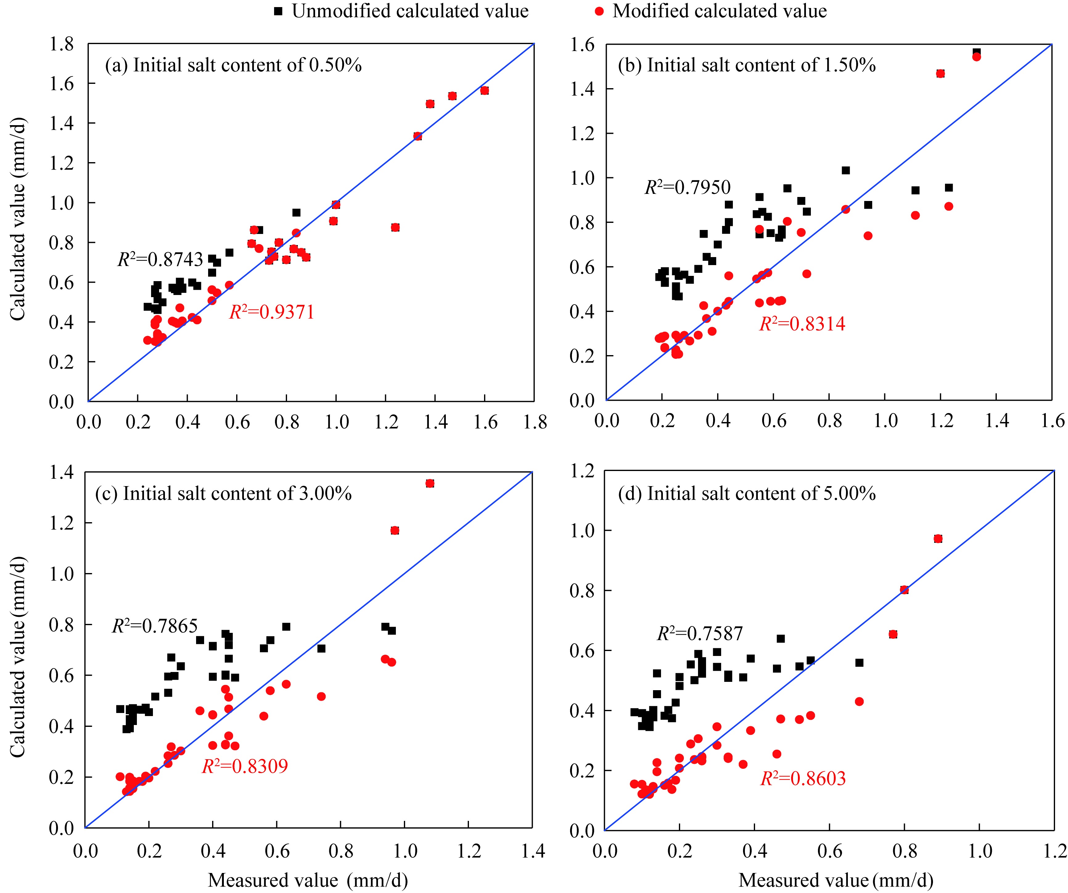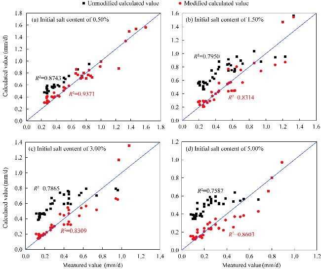 Fig. 12 Correlation analysis between the calculated values and the measured values of evaporation rate with different initial salt contents. (a), initial salt content of 0.50%; (b), initial salt content of 1.50%; (c), initial salt content of 3.00%; (d), initial salt content of 5.00%. The blue diagonal line represents the ideal reference line indicating perfect agreement between calculated and measured values. |