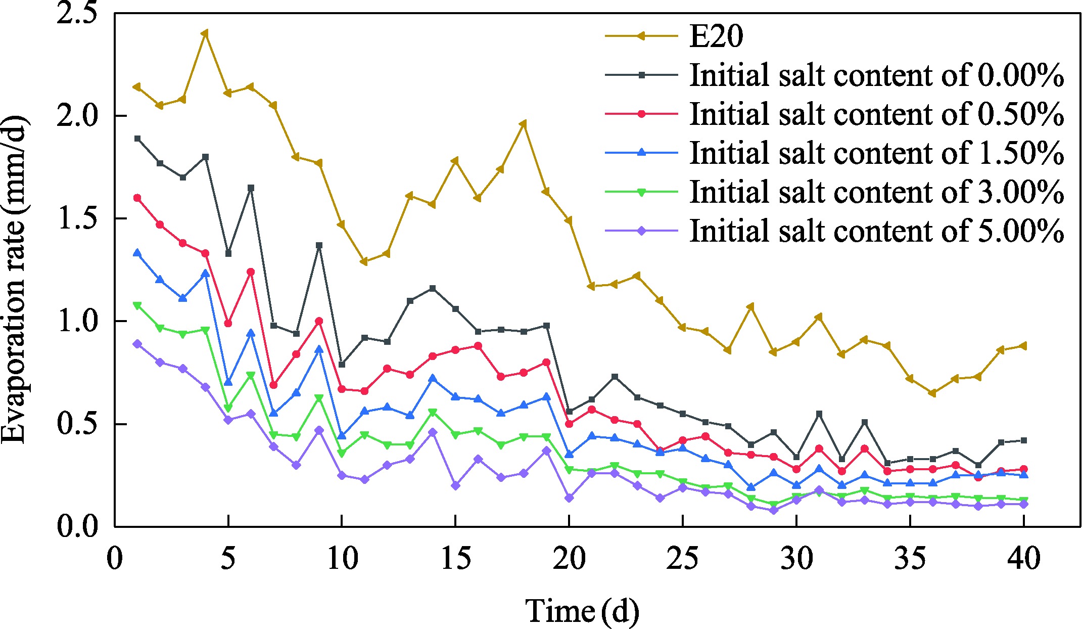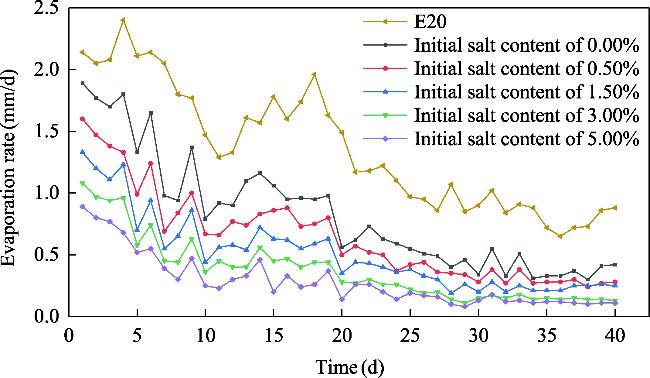 Fig. 2 Change in the evaporation rate of the soil columns with different initial salt contents over time. E20 represents the potential evaporation rate of atmosphere. |