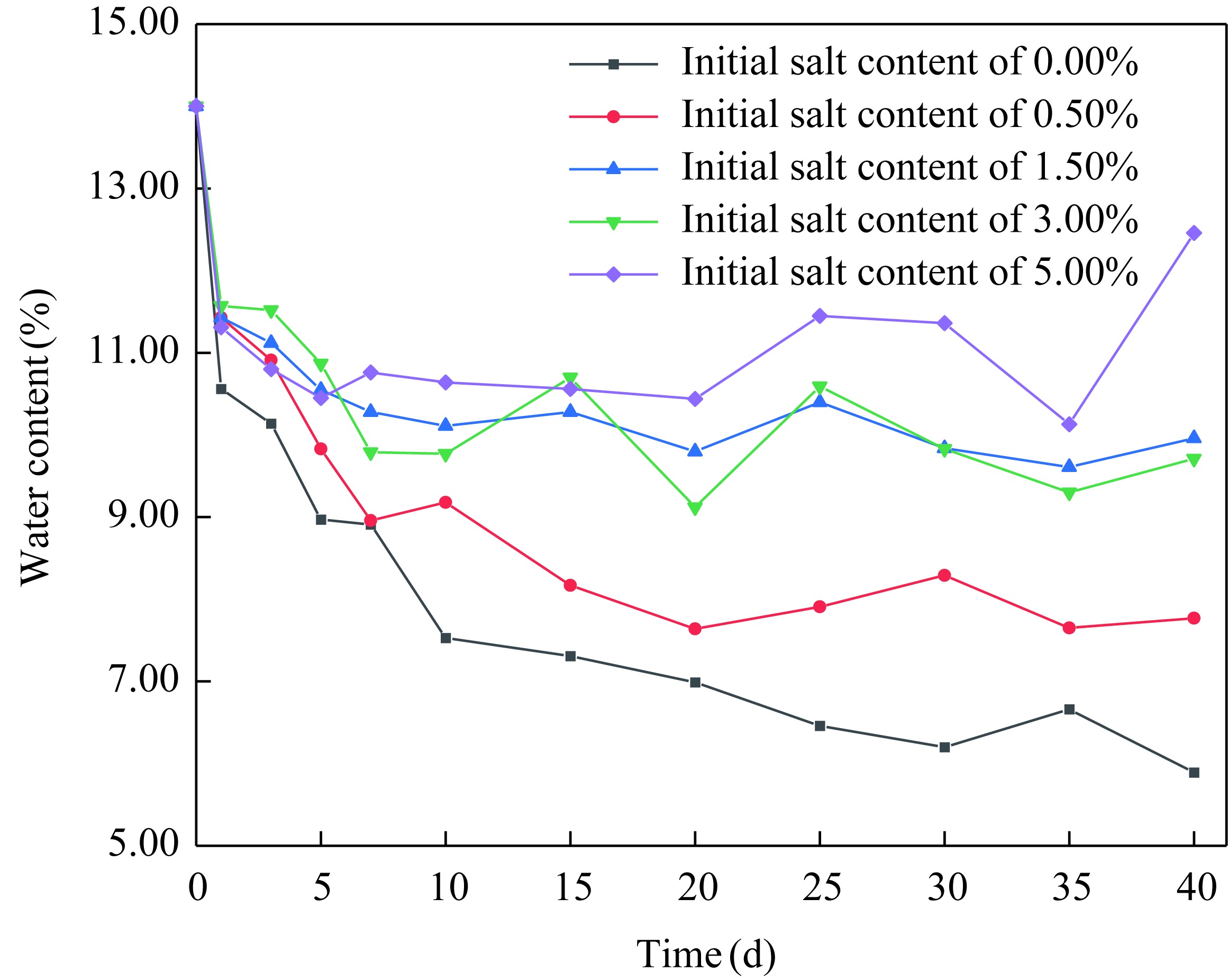 Fig. 4 Variation in water content on the surface of the soil columns with different initial salt contents over time |