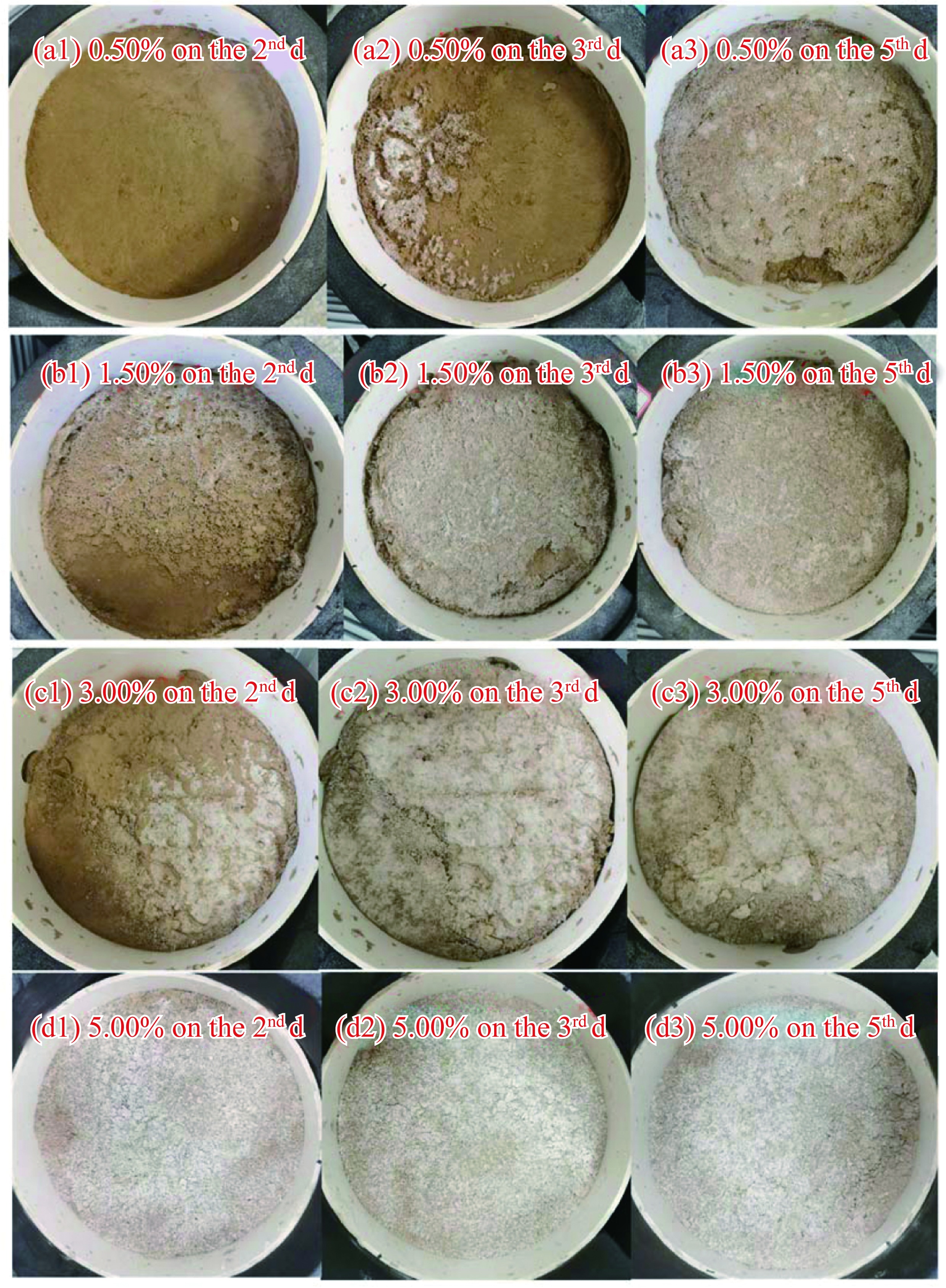 Fig. 5 Salt accumulation on the surface of the soil columns with initial salt contents of 0.50% (a1-a3), 1.50% (b1-b3), 3.00% (c1-c3), and 5.00% (d1-d3) on the 2nd, 3rd, and 5th d of the evaporation experiment |