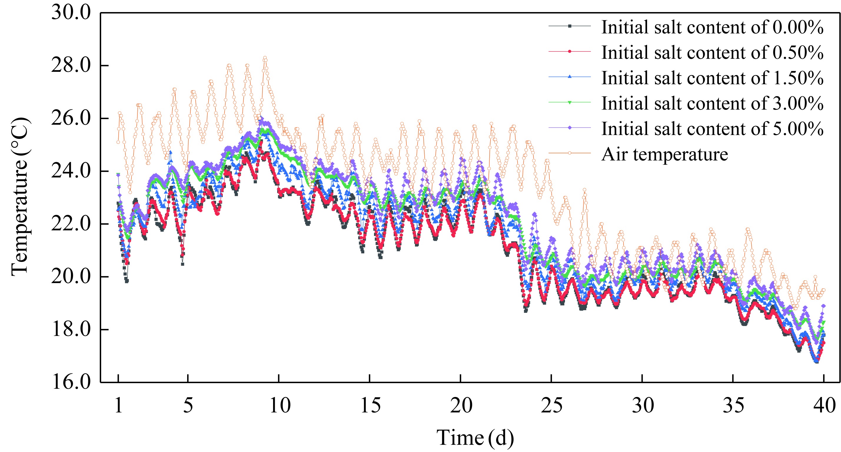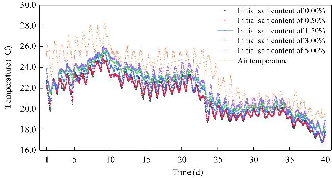 Fig. 7 Variation in the surface temperature of the soil columns with different initial salt contents |