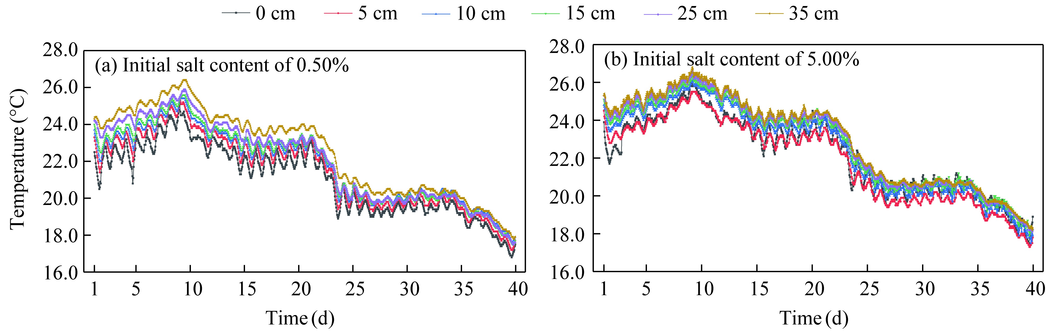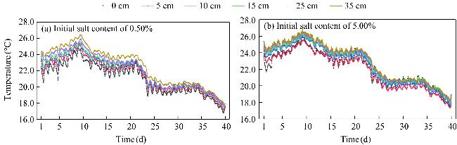 Fig. 8 Variation in the soil temperature at different depths with initial salt content of 0.50% (a) and 5.00% (b) |