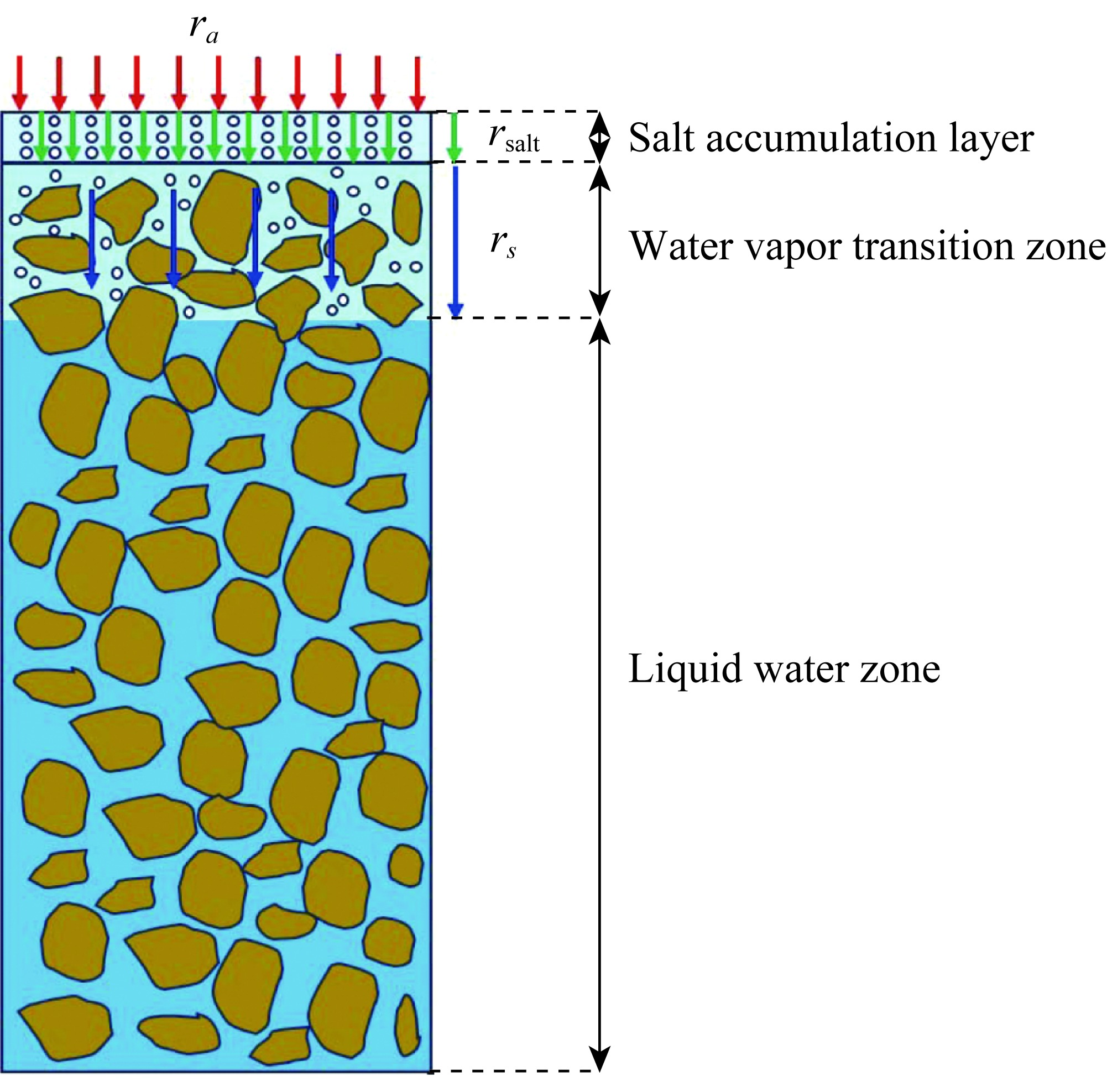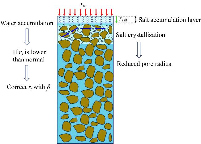 Fig. 9 Schematic of evaporation resistance model. The red arrow represents air resistance (ra), blue arrow represents soil surface resistance (rs), and green arrow represents salt shell resistance (rsalt). The downward arrow indicates the impedance to upward water migration. |